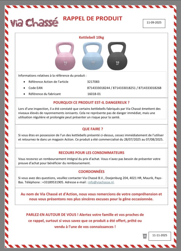 Un rappel de produit a été officiellement lancé par la société Via Chassé le 11 septembre 2025 concernant des kettlebells de 10 kg commercialisés dans les magasins Action entre le 28 juillet et le 7 août 2025. Ce rappel fait suite à la détection de niveaux élevés de rayonnements ionisants, pouvant présenter un risque pour la santé en cas d’exposition prolongée.